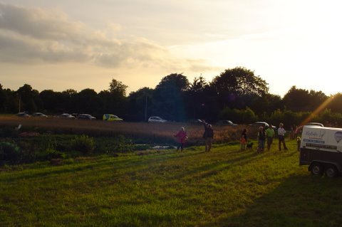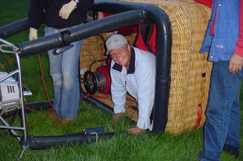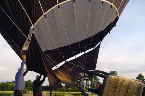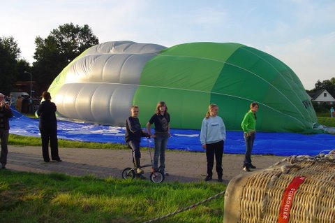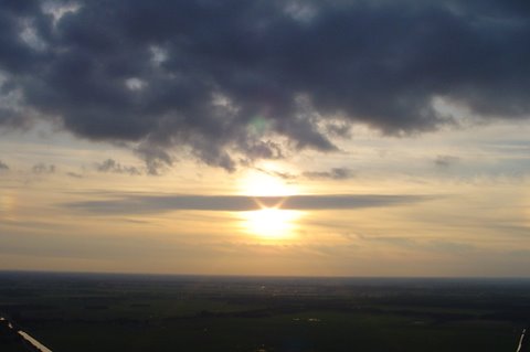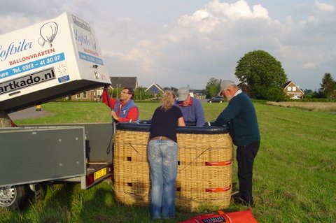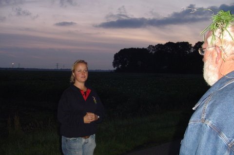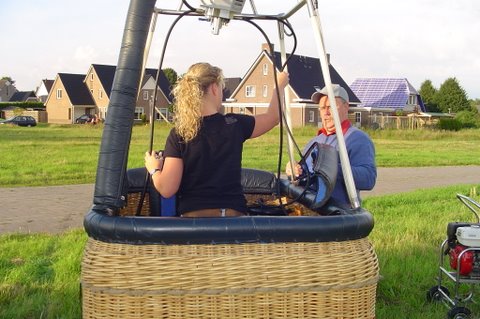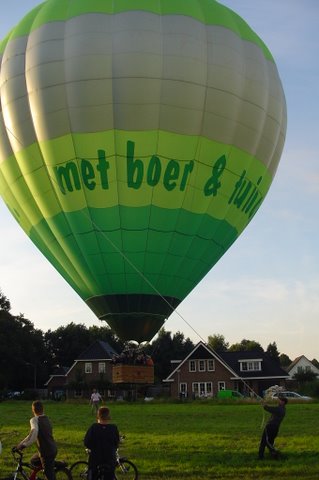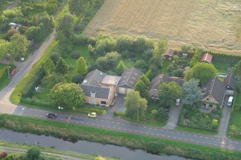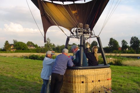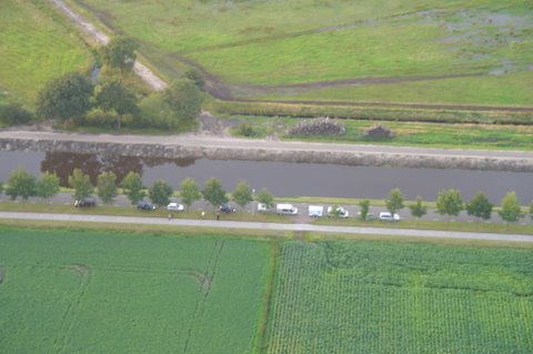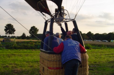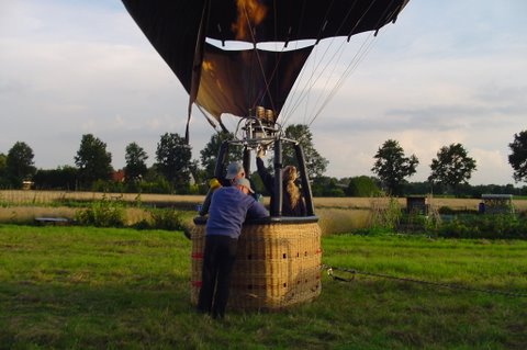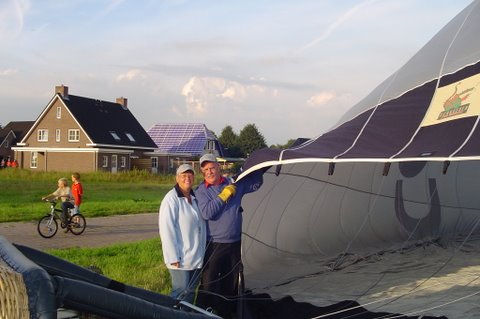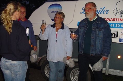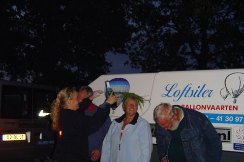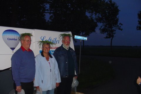 Ik vertel even over de doping. Aan het eind van de vaart werden we gedoopt. Er werd een bosje gras op ons hoofd gelegd, daarna ging de piloot met een aansteker een plukje haar, samen met wat gras verbranden of zeg maar samen smelten. Toen werd de champagne fles open gemaakt. De piloot goot over ieders hoofd een scheutje champagne. En gedoopt waren we!!! Maar we werden ook nog in de adelstand verheven. Onze namen zijn nu: Cor, Geert en Lammy Jonkheer/Jonkvrouwe van Nieuw-Balinge tot Dalen. Daarna hebben we met elkaar de fles champagne leeg gedronken.