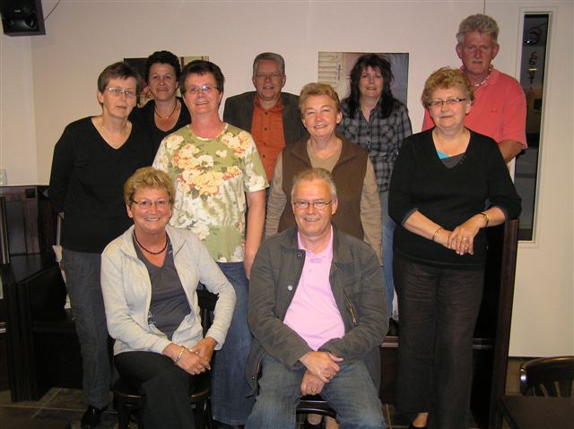 Staand vlnr: Ally Dolfing – Zomer, Geke Strijker – Sok, Tini Sok – van Zwol,Tinus Post, Jannie Bekman – Koopman, Clarie Okken – Post, Trieneke Wolters – Zomer, Albert Wielink. Zittend; José Post – Consent, Marinus Post |